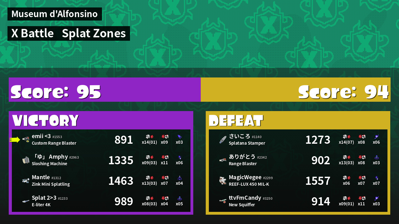 | Tear-Stained Rebel  さいころ #1140 |  Splatana Stamper                    | M | 1,273 | 7 + 7 | 8 | 0.88 |  6 | |