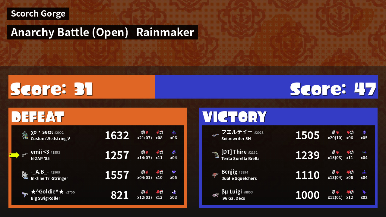 | Medals | #1 Splat Assister #1 Rainmaker Stopper #1 Ground Traveler | ||