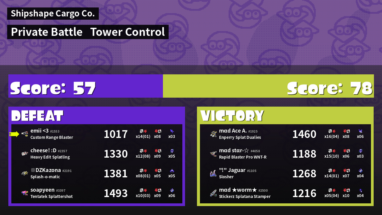 | Self-Taught Triple Inkstrike User  soapyeen #3397 |  Tentatek Splattershot                    | 1,493 | 7 + 3 | 9 | 0.78 |  6 | |