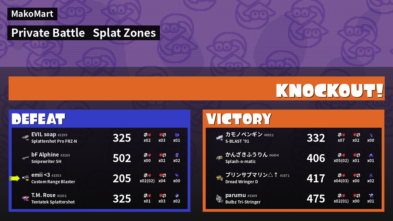 | Mode | Splat Zones - Private Battle | ||