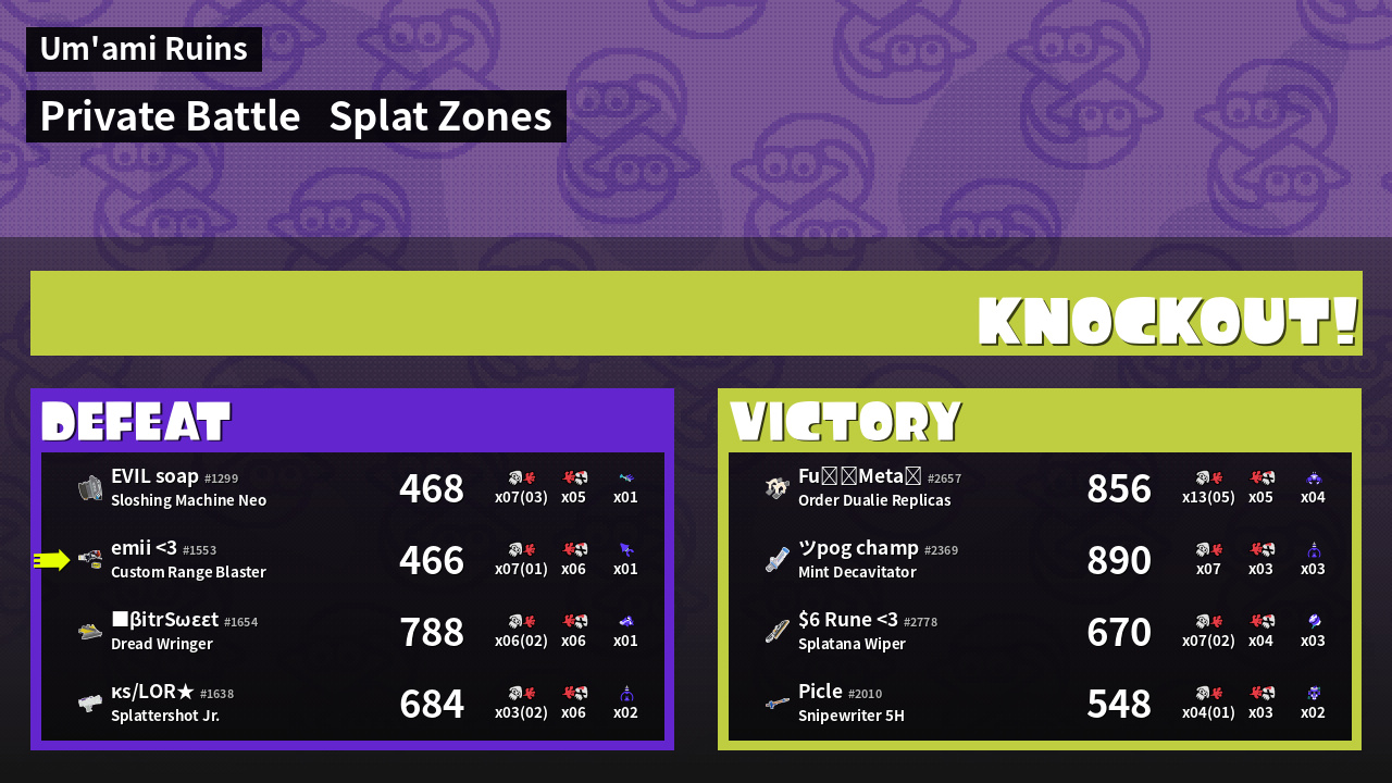 | Medals | #1 Overall Splatter #1 Splat Zone Guard #1 Enemy Splatter | ||