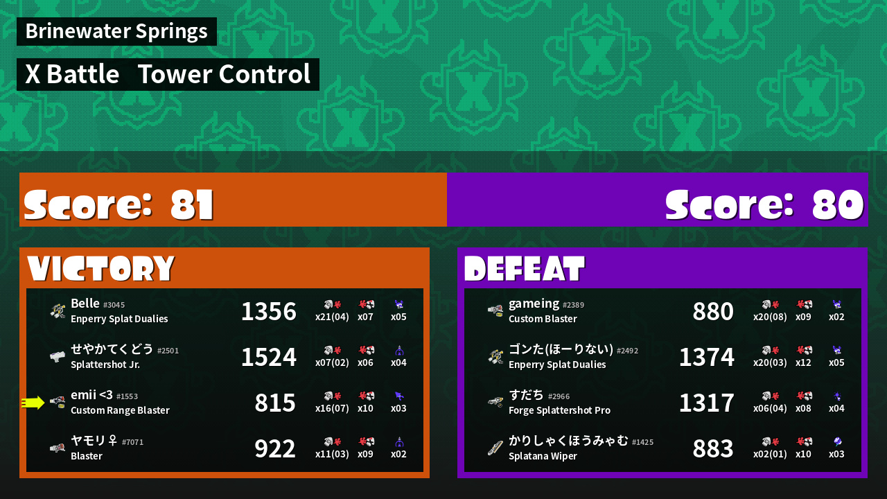 | Medals | Record-Score Setter #1 Splat Assister #1 Tower Stopper | ||