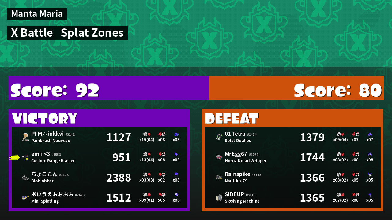 | Medals | #1 Splat Zone Guard #1 Popular Target #1 Splat Assister | ||