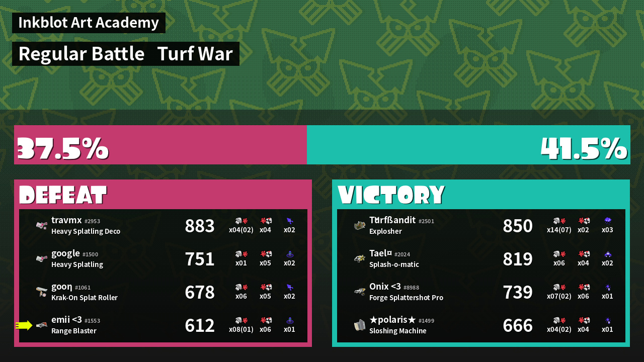 | Medals | #1 Overall Splatter #1 Enemy-Base Inker #1 Super Jump Spot | ||