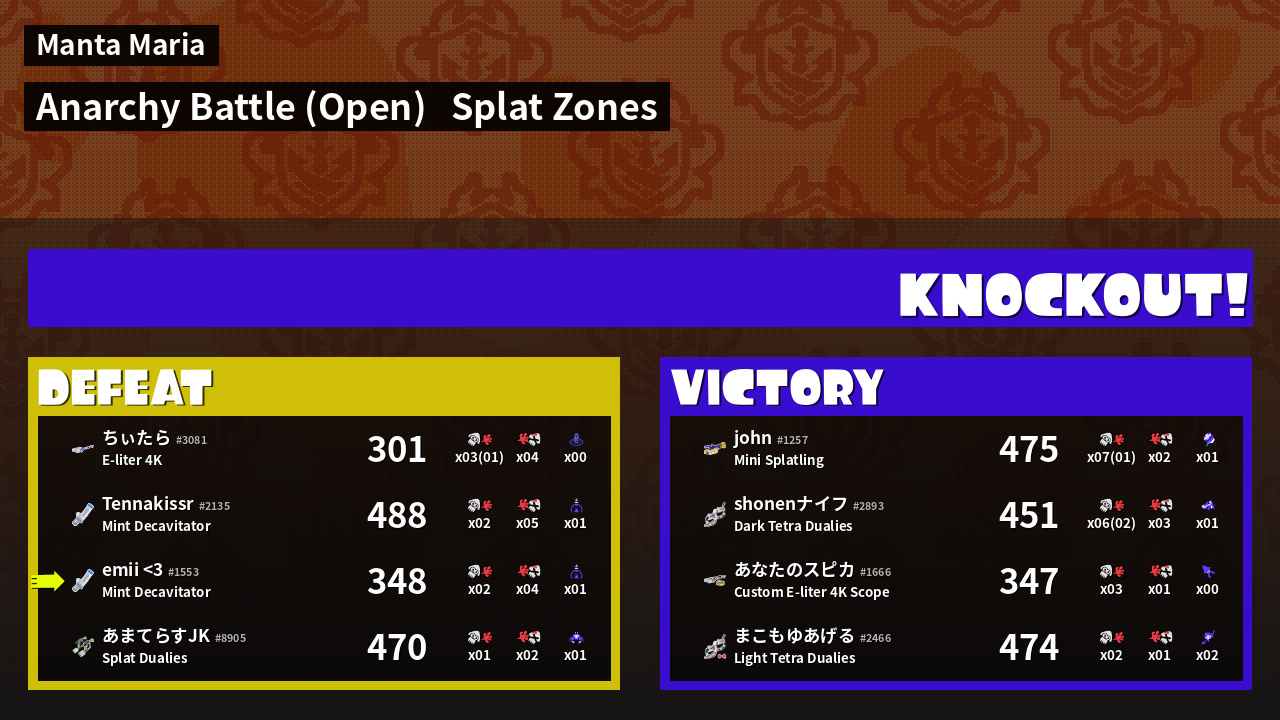 | Mode | Splat Zones - Anarchy Battle (Open) | ||