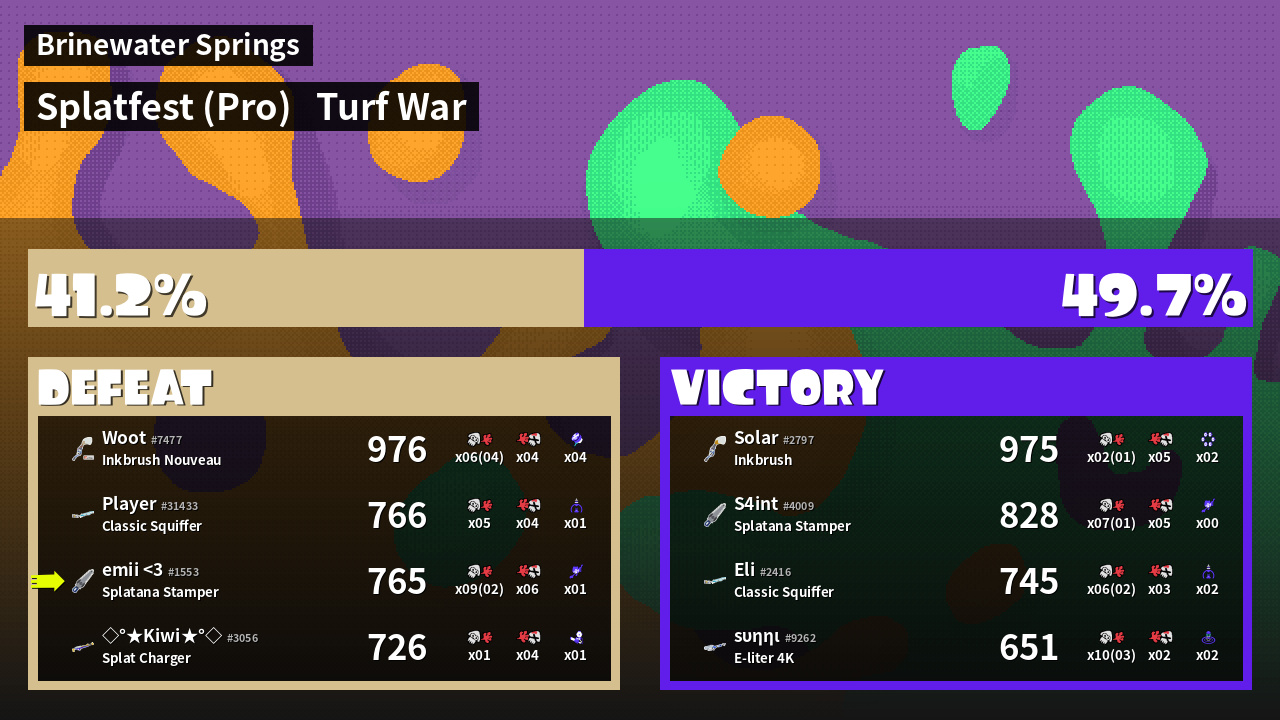 | Name | Weapon | Inked |  k |  d | KR | Sp | |