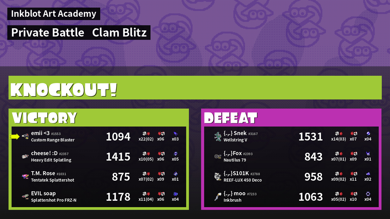 | Mode | Clam Blitz - Private Battle | ||