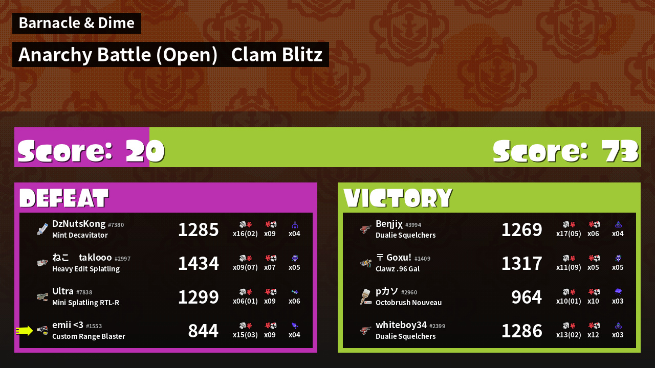 | Mode |  Clam Blitz -  Anarchy Battle (Open) | ||