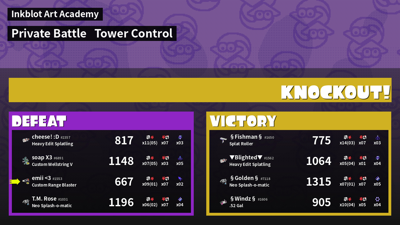 | Medals | #1 Enemy Splatter First Splat! #1 Kraken Royale User | ||