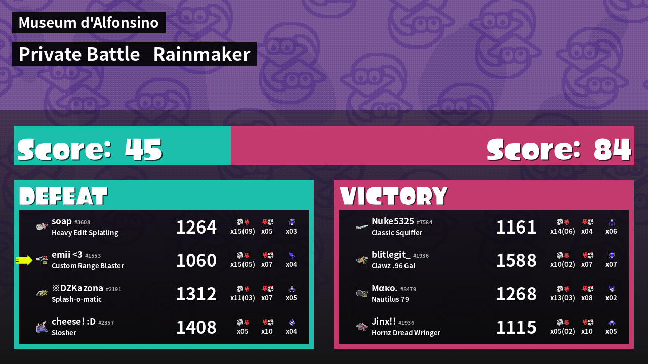 | Self-Taught Marina Fan  soap #3608 |  Heavy Edit Splatling                    | 1,264 | 6 + 9 | 5 | 1.20 |  3 | |
