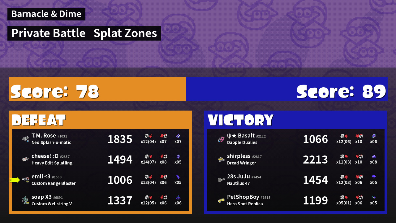 | Mode | Splat Zones - Private Battle | ||