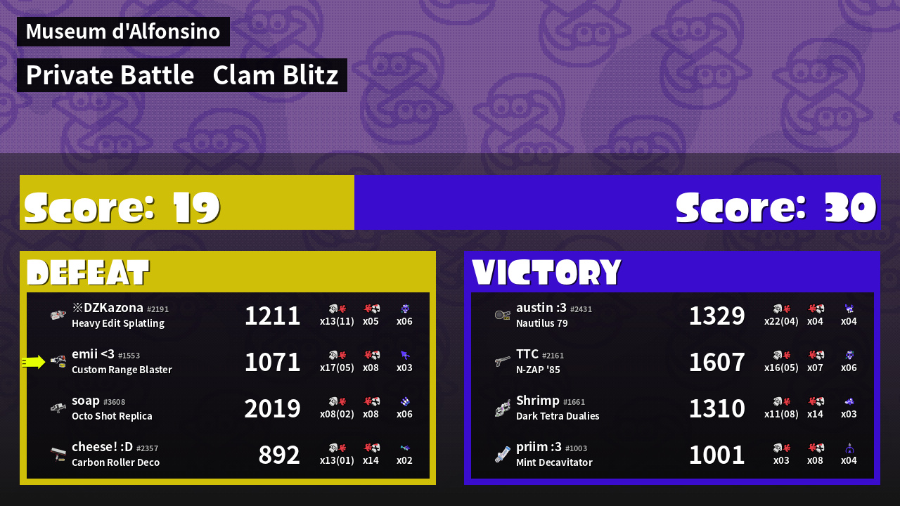 | Mode | Clam Blitz - Private Battle | ||