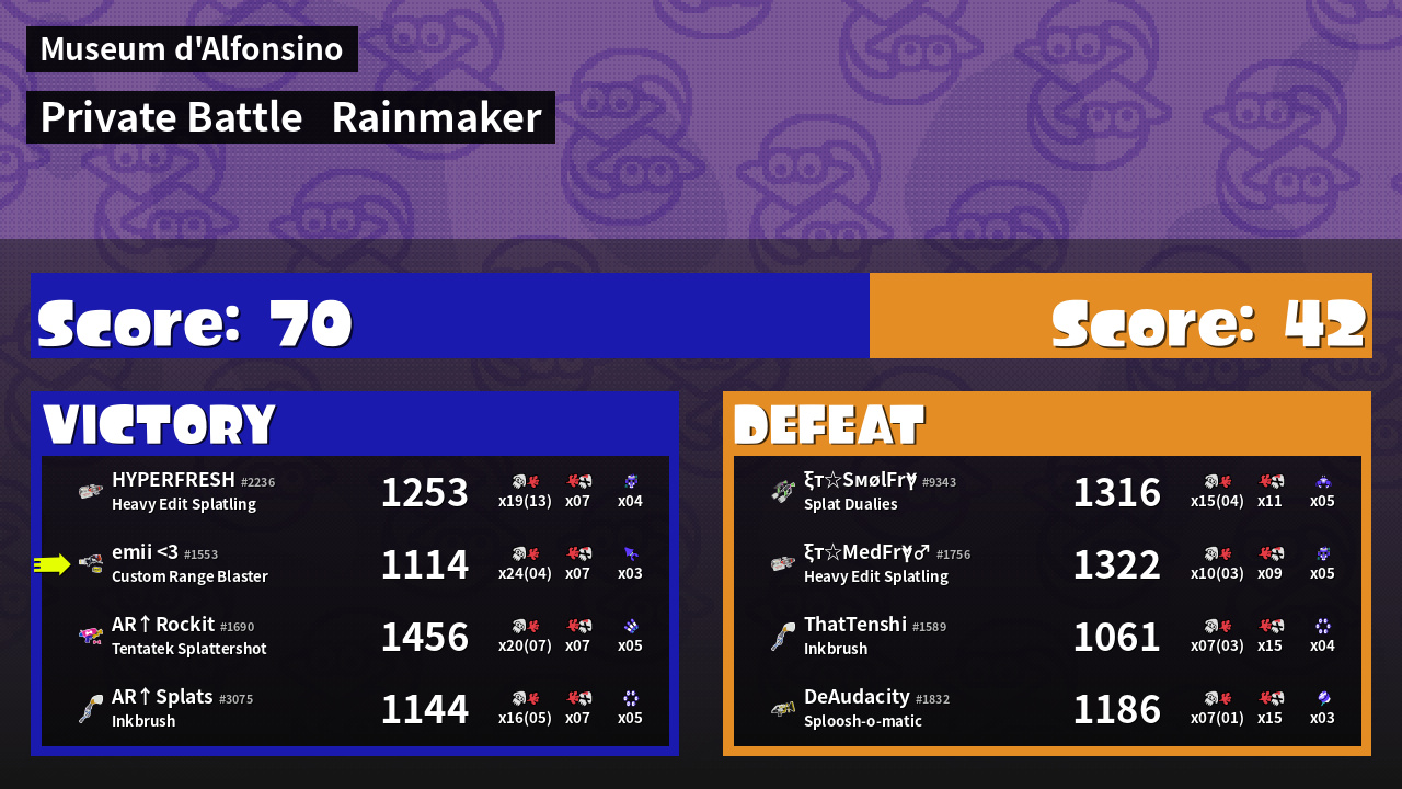 | Medals | #1 Overall Splatter #1 Enemy Splatter #1 Kraken Royale User | ||