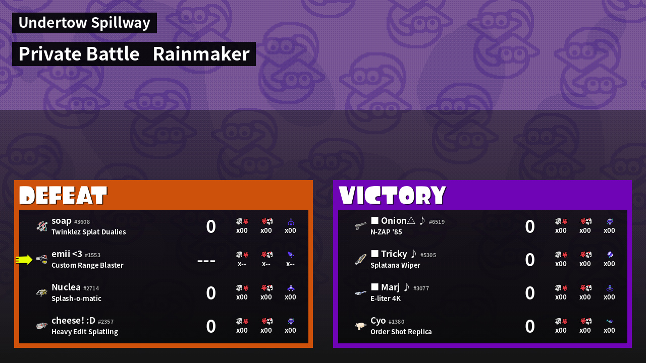 | Out-of-Options Otherworldly Being  ■ Tricky ♪ #5305 |  Splatana Wiper                    | 0 | 0 + 0 | 0 | 1.00 |  0 | |
