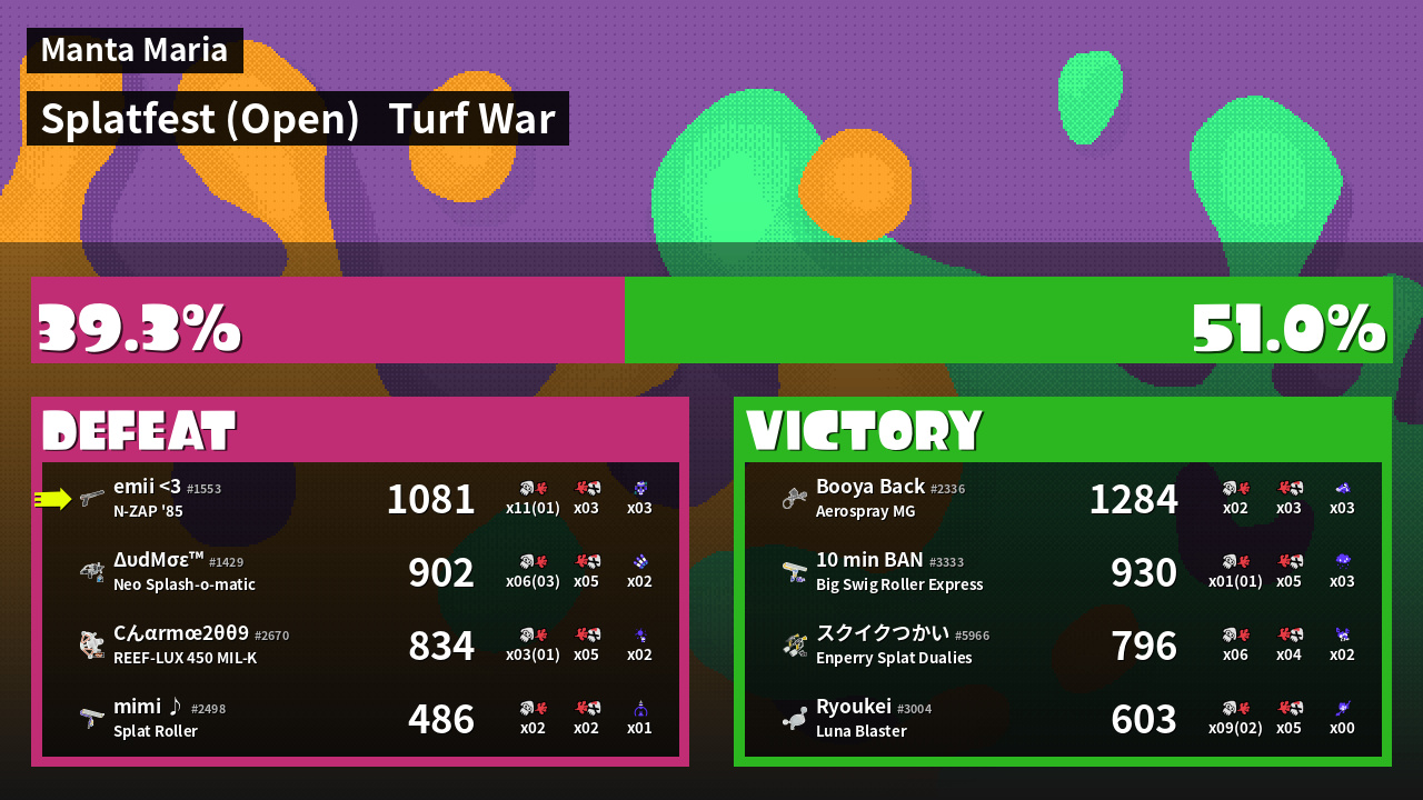 | Memversal Youth  mimi ♪ #2498 |  Splat Roller                    | 486 | 2 + 0 | 2 | 1.00 |  1 | |