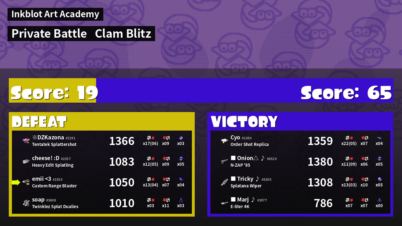 | Out-of-Options Otherworldly Being  ■ Tricky ♪ #5305 |  Splatana Wiper                    | 1,308 | 10 + 3 | 10 | 1.00 |  5 | |