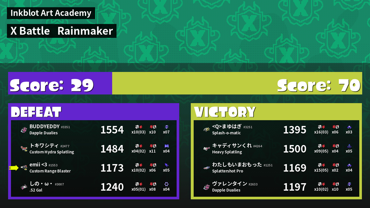 | Medals | #1 Overall Splatter #1 Enemy Splatter #1 Rainmaker Stopper | ||