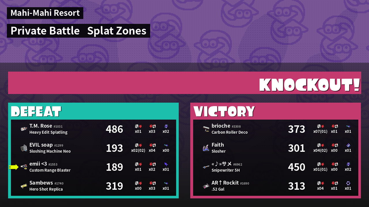 | Medals | #1 Enemy Splatter #1 Splat Zone Hero #1 Damage Taker | ||
