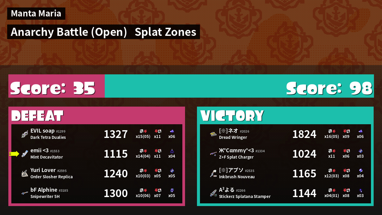 | Mode | Splat Zones - Anarchy Battle (Open) | ||