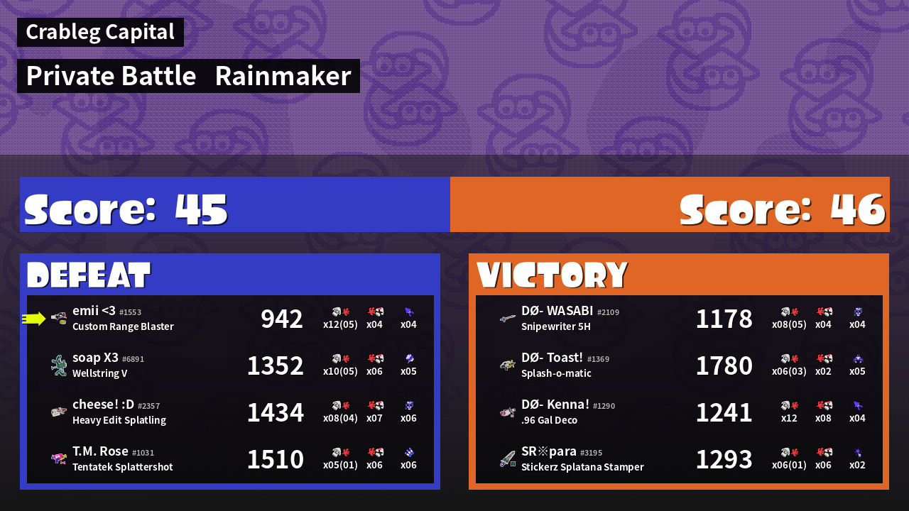 | Ice-Cold Kraken Royale User  DØ- WASABI #2109 |  Snipewriter 5H                    | 1,178 | 3 + 5 | 4 | 0.75 |  4 | |