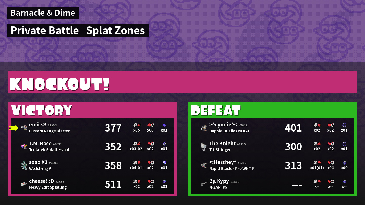 | Mode | Splat Zones - Private Battle | ||