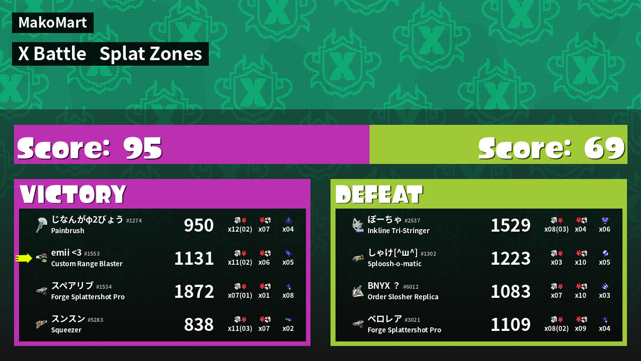 | Medals | #1 Splat Zone Guard #1 Popular Target #2 Overall Splatter | ||