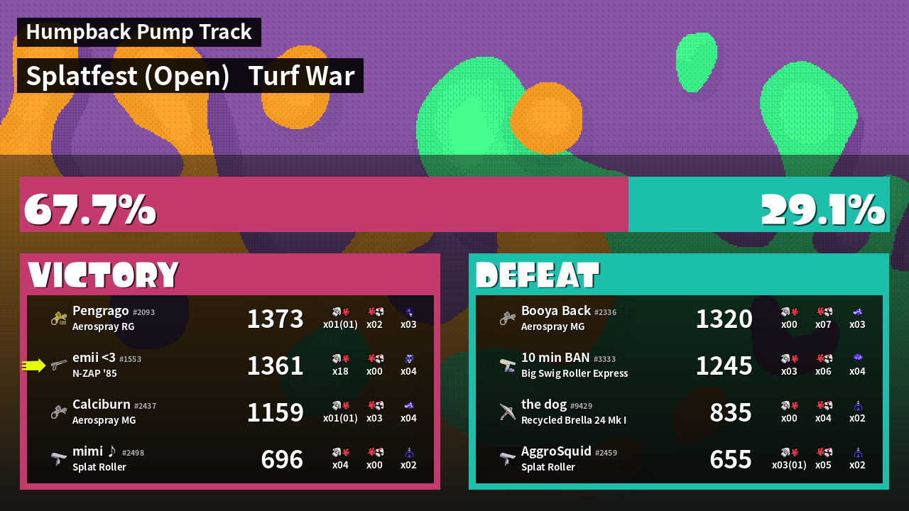 | Medals | #1 Overall Splatter #1 Popular Target #1 Enemy-Base Inker | ||