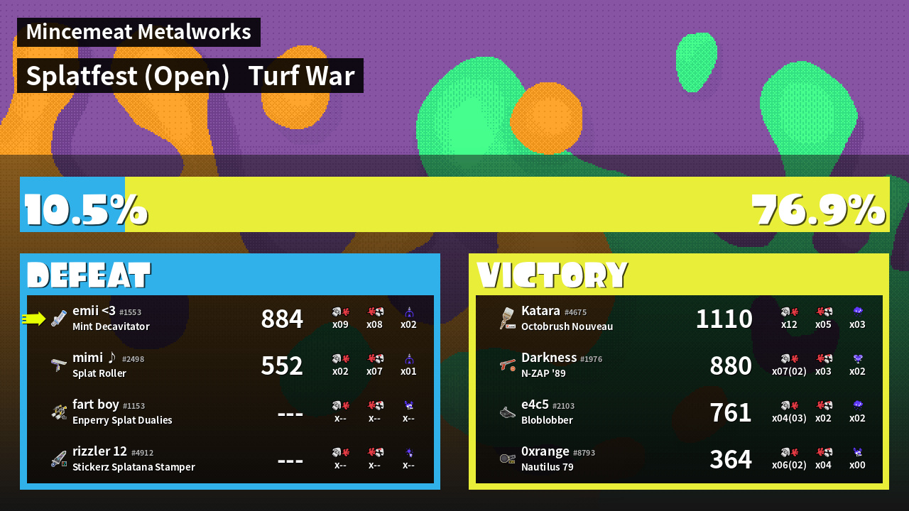 Kills / Deaths | 9 + 0 / 8 > Kill Ratio: 1.12 | ||