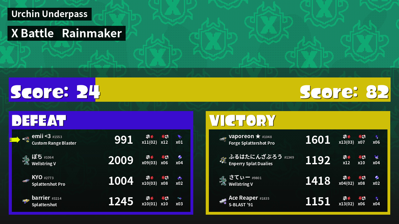 | Medals | #1 Overall Splatter #1 Score Booster Record-Score Setter | ||