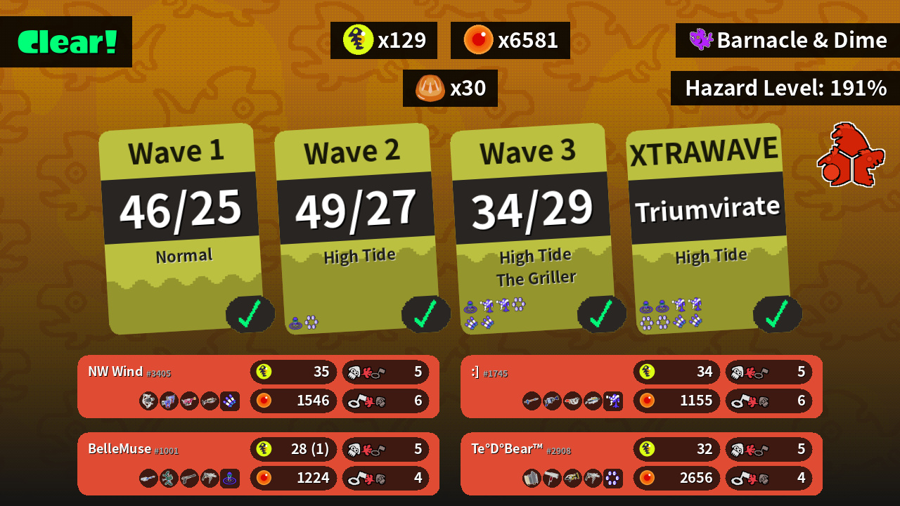 | Weapons | REEF-LUX 450 Glooga Dualies Rapid Blaster Pro Grizzco Charger | Snipewriter 5H H-3 Nozzlenose Goo Tuber Grizzco Brella | Sloshing Machine Flingza Roller Sploosh-o-matic Grizzco Roller | E-liter 4K Wellstring V N-ZAP '85 Grizzco Roller |