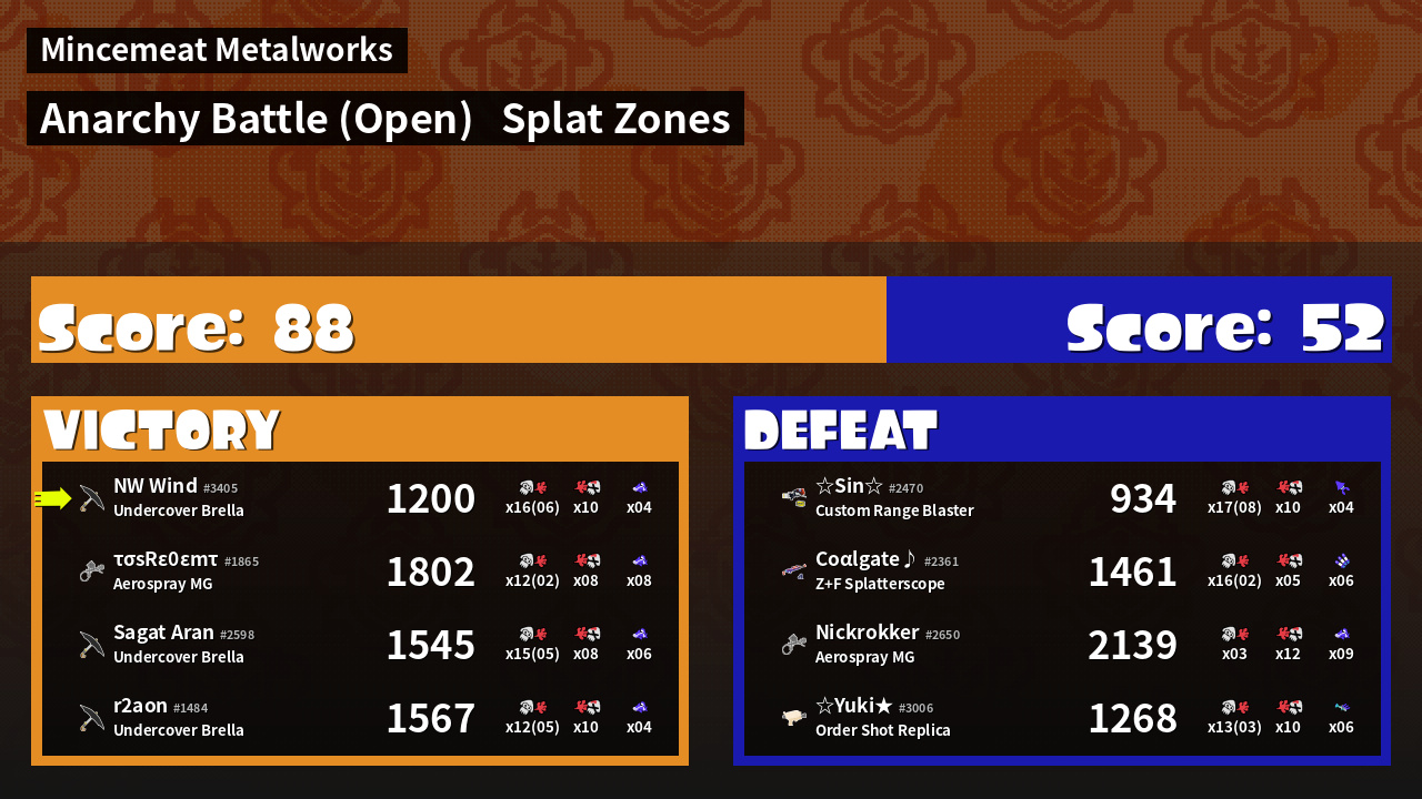 | Mode | Splat Zones - Anarchy Battle (Open) | ||