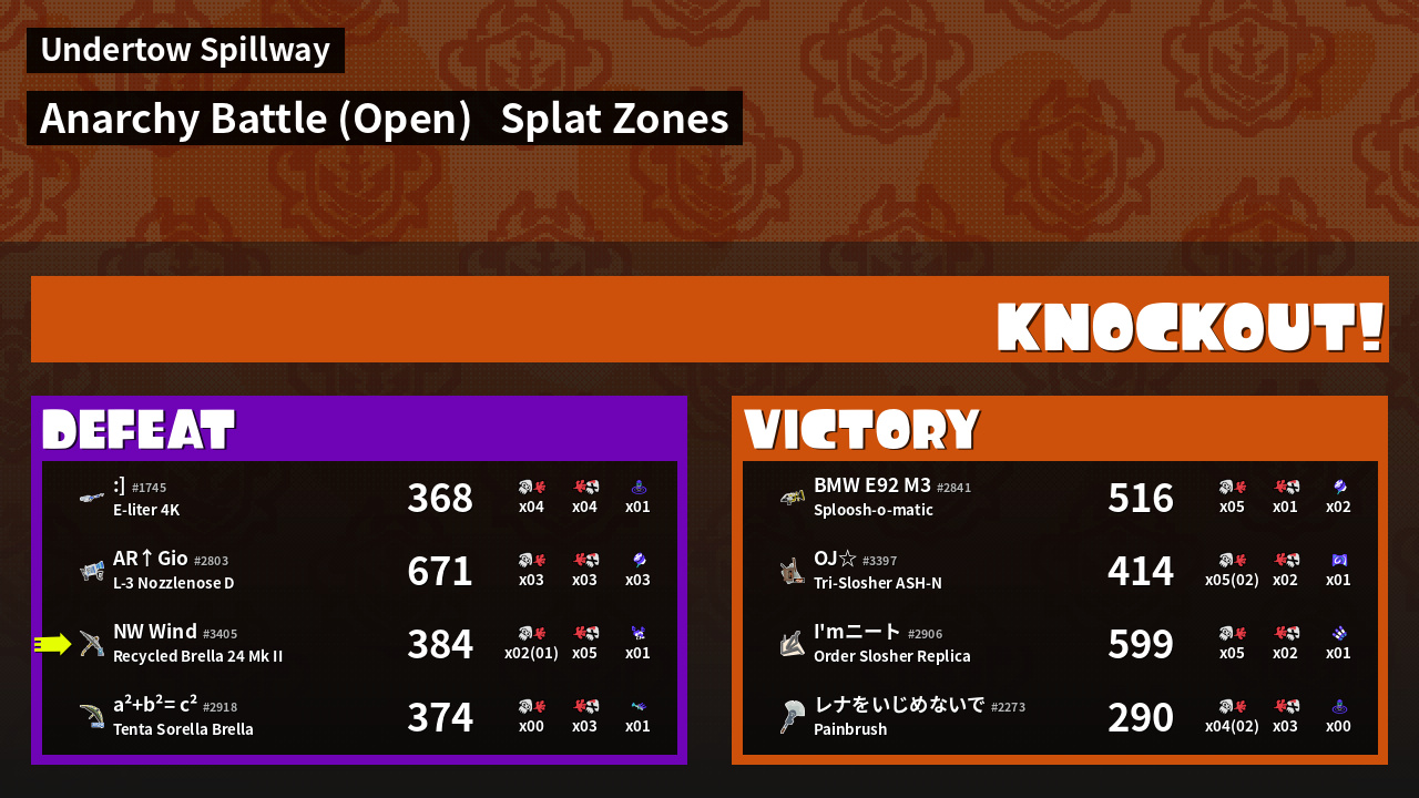 | Mode | Splat Zones - Anarchy Battle (Open) | ||