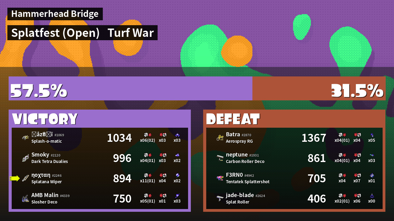 | Medals | #1 Overall Splatter #1 Popular Target #1 Enemy-Base Inker | ||