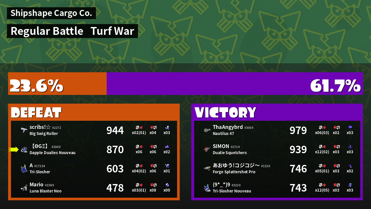| Medals | #1 Overall Splatter #1 Enemy-Base Inker #1 Enemy Splatter | ||