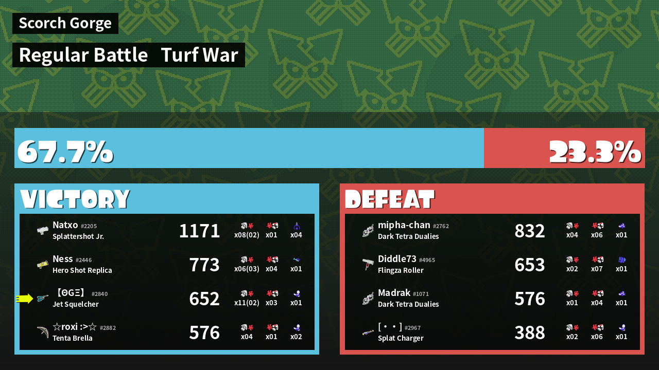 | Medals | #1 Overall Splatter #1 Popular Target #1 Enemy-Base Inker | ||