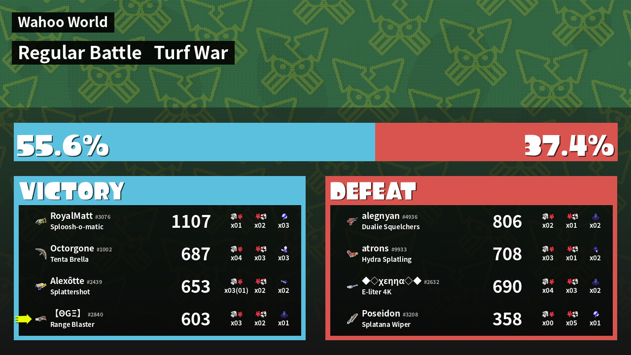 | Medals | #1 Popular Target #1 Damage Taker #1 Ink Consumer | ||