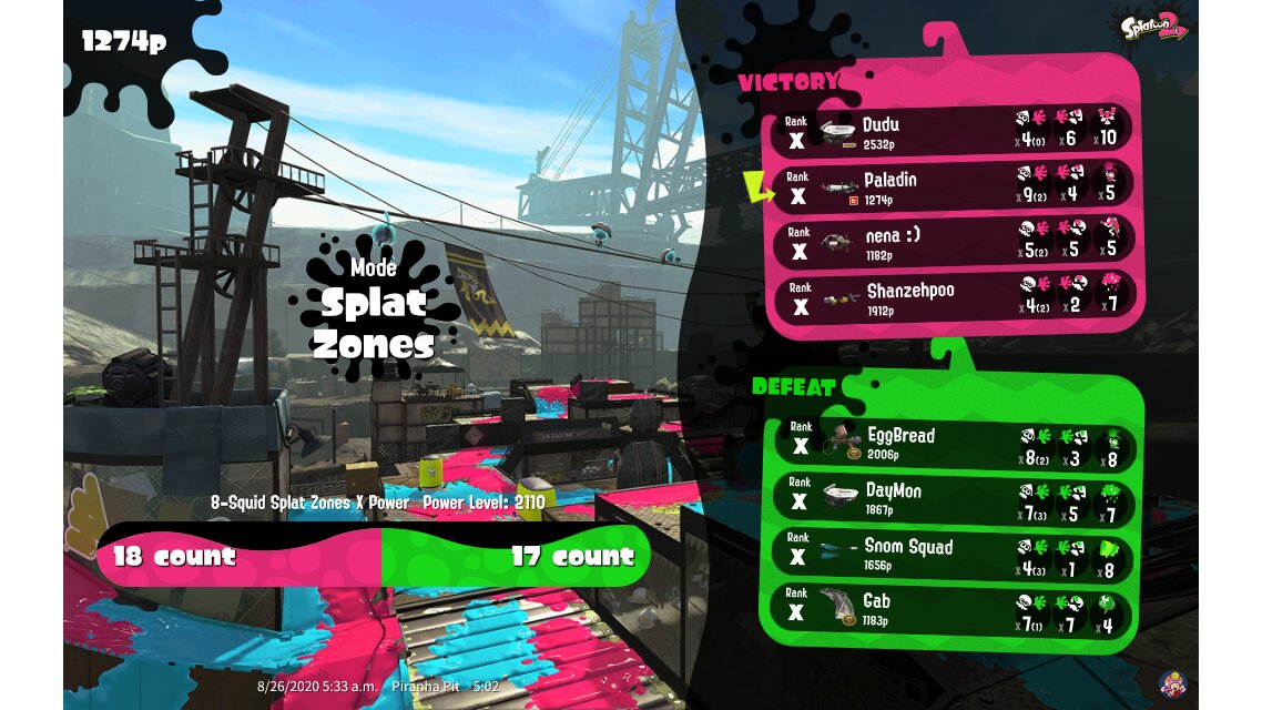 | Mode | Splat Zones - Ranked Battle | ||||||||||||||||