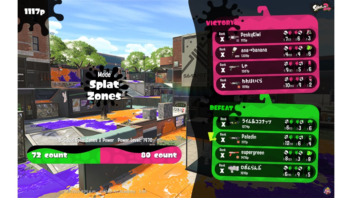| Mode | Splat Zones - Ranked Battle | ||||||||||||||||