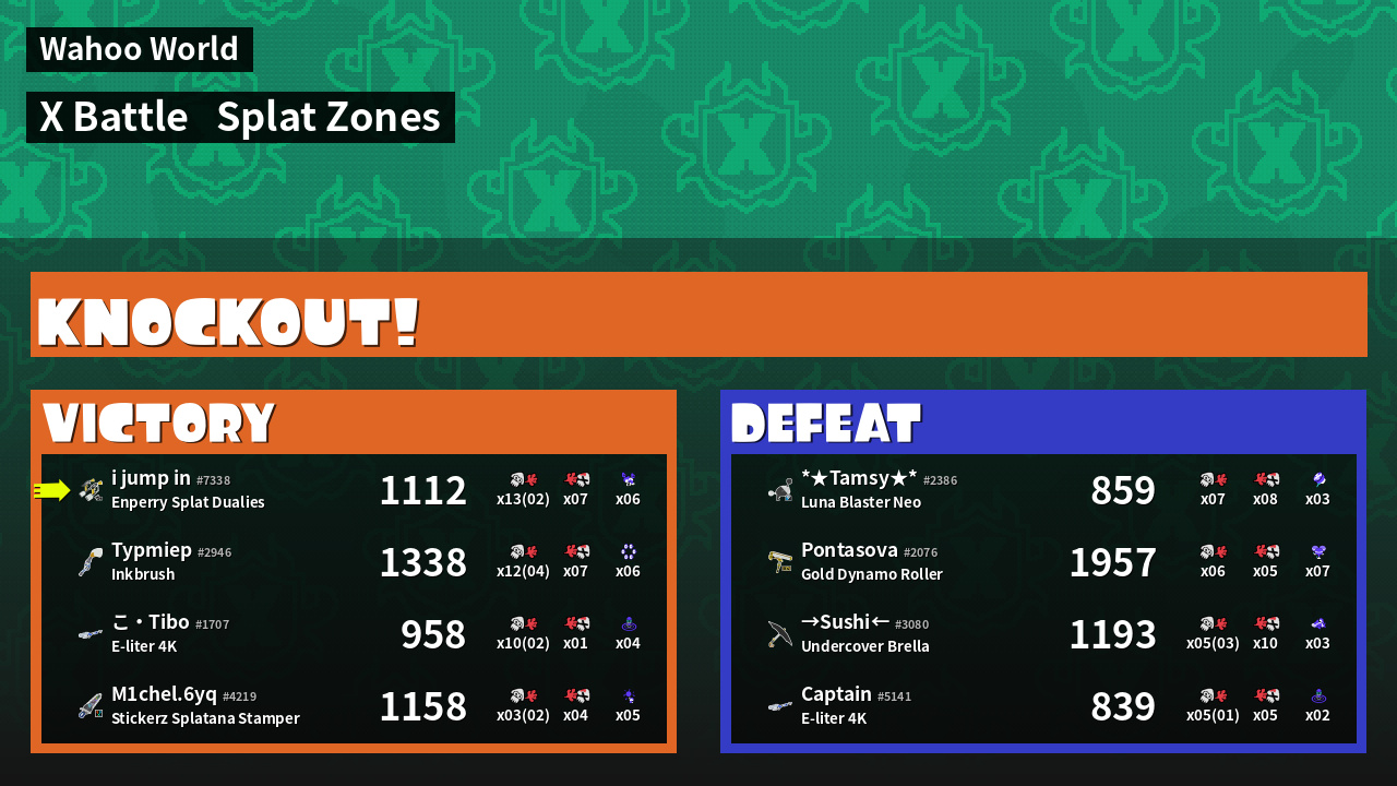 | Weapon | Enperry Splat Dualies ( Curling Bomb / Triple Splashdown) |
