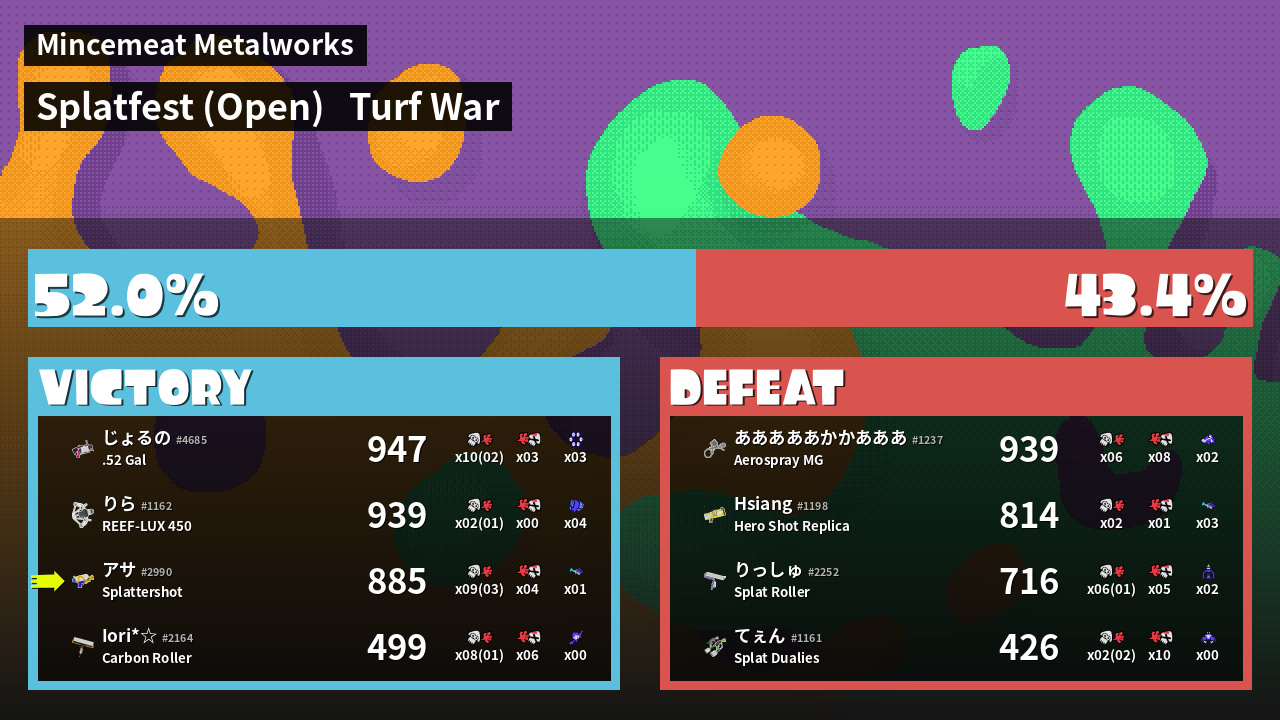 | Medals | #1 Enemy-Base Inker #1 Splat Assister #2 Overall Splatter | ||