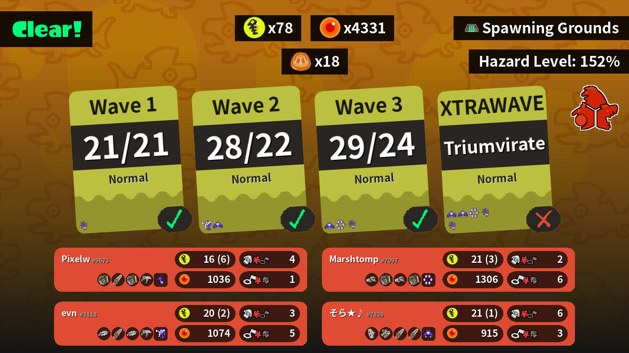 | Weapons | Grizzco Slosher Grizzco Splatana Grizzco Slosher Grizzco Roller | Grizzco Blaster Grizzco Slosher Grizzco Blaster Grizzco Slosher | Grizzco Stringer Grizzco Dualies Grizzco Splatana Grizzco Splatana | Grizzco Brella Grizzco Splatana Grizzco Brella Grizzco Roller |