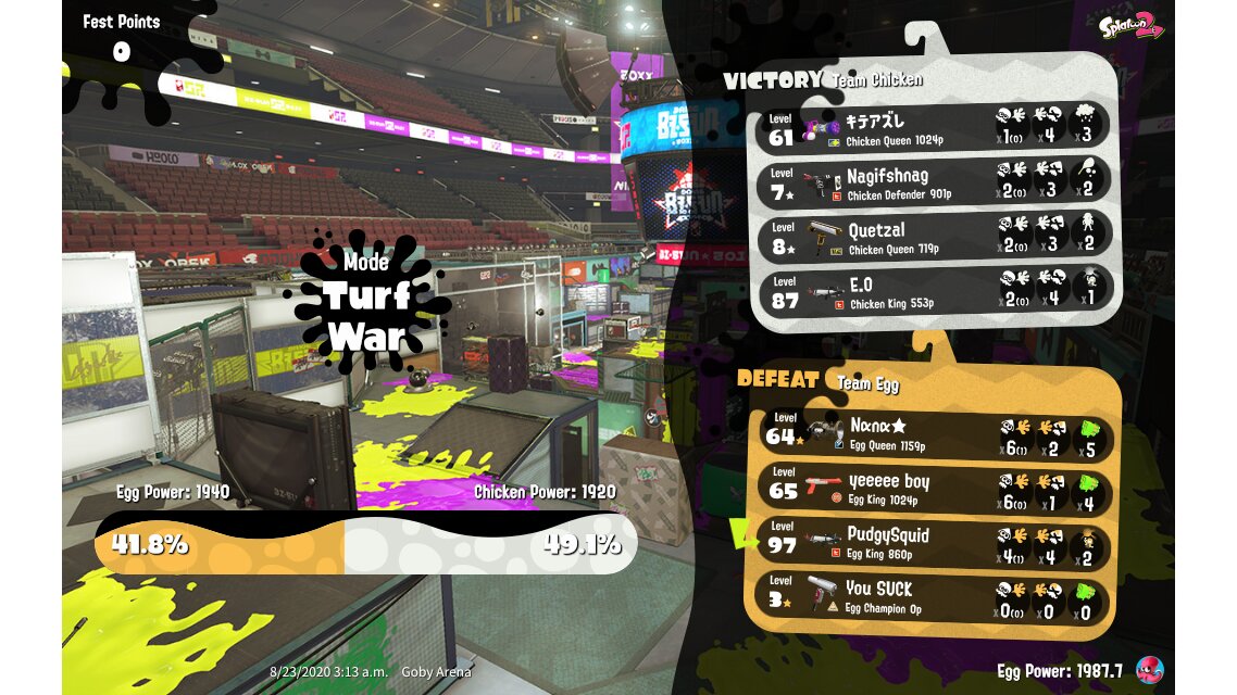 | Mode | Turf War - Splatfest (Pro) | ||||||||||||||||