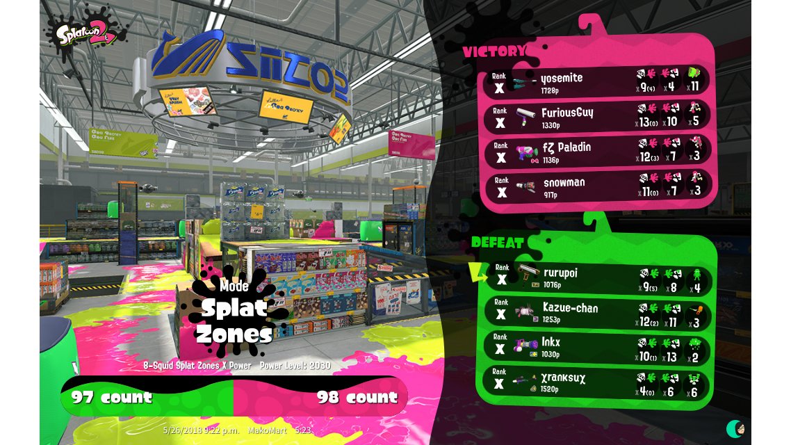 | Mode | Splat Zones - Ranked Battle | ||||||||||||||||||||||||||||