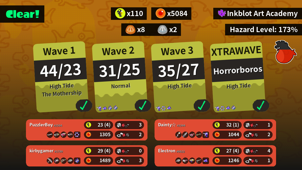 | Weapons | Classic Squiffer Splattershot Nova Rapid Blaster Range Blaster | Inkbrush Splatana Stamper Rapid Blaster Pro Bamboozler 14 Mk I | Splat Brella .52 Gal Squeezer Grizzco Brella | Grizzco Brella Heavy Splatling Splattershot N-ZAP '85 |