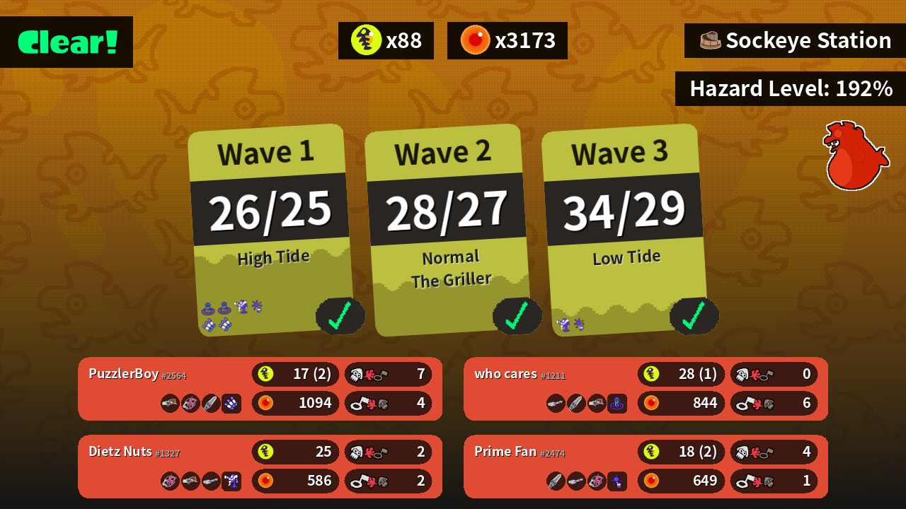 | Weapons | Range Blaster Dapple Dualies Splatana Stamper | E-liter 4K Splatana Stamper Range Blaster | Dapple Dualies Range Blaster E-liter 4K | Splatana Stamper E-liter 4K Dapple Dualies |
