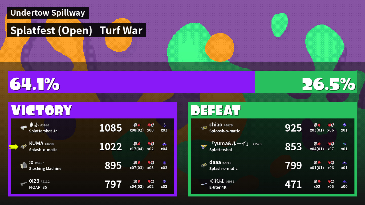 | Medals | #1 Overall Splatter #1 Popular Target #1 Enemy-Base Inker | ||