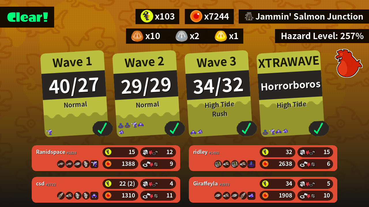| Weapons | Grizzco Charger Grizzco Charger Grizzco Brella Grizzco Stringer | Grizzco Brella Grizzco Blaster Grizzco Brella Grizzco Splatana | Grizzco Slosher Grizzco Blaster Grizzco Slosher Grizzco Blaster | Grizzco Splatana Grizzco Blaster Grizzco Stringer Grizzco Stringer |