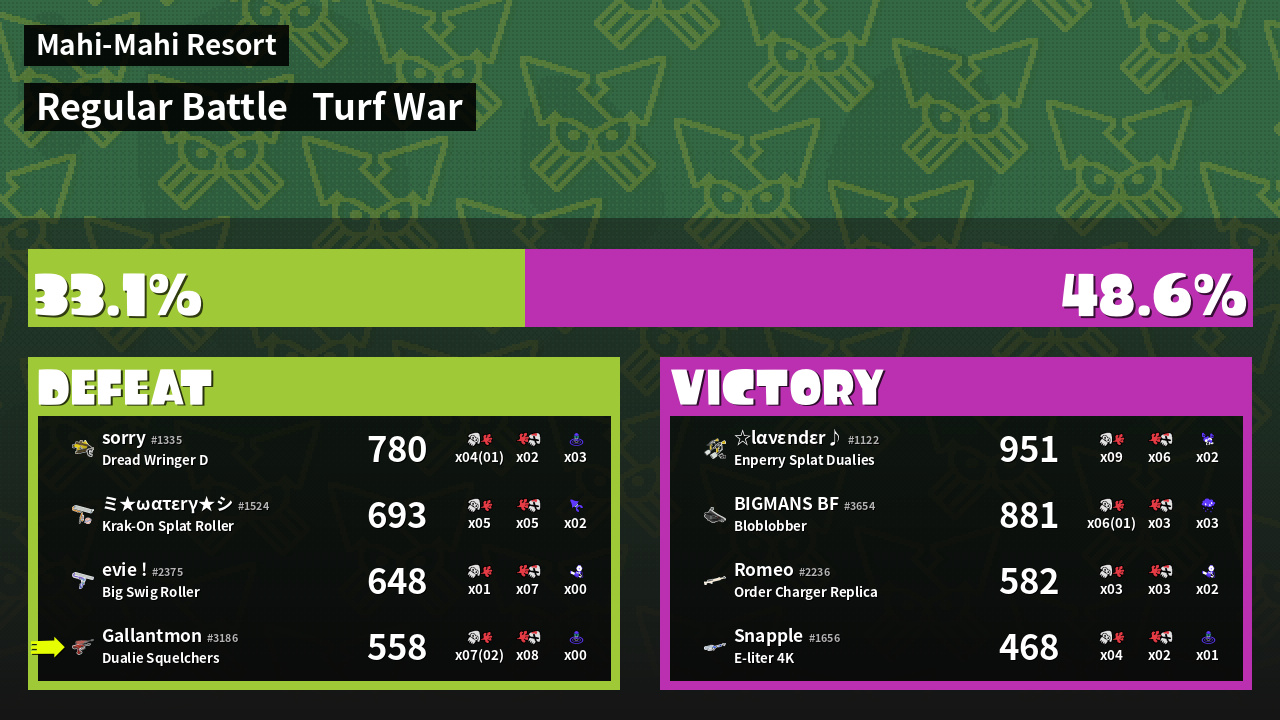 | Medals | #1 Overall Splatter #1 Popular Target #1 Enemy-Base Inker | ||