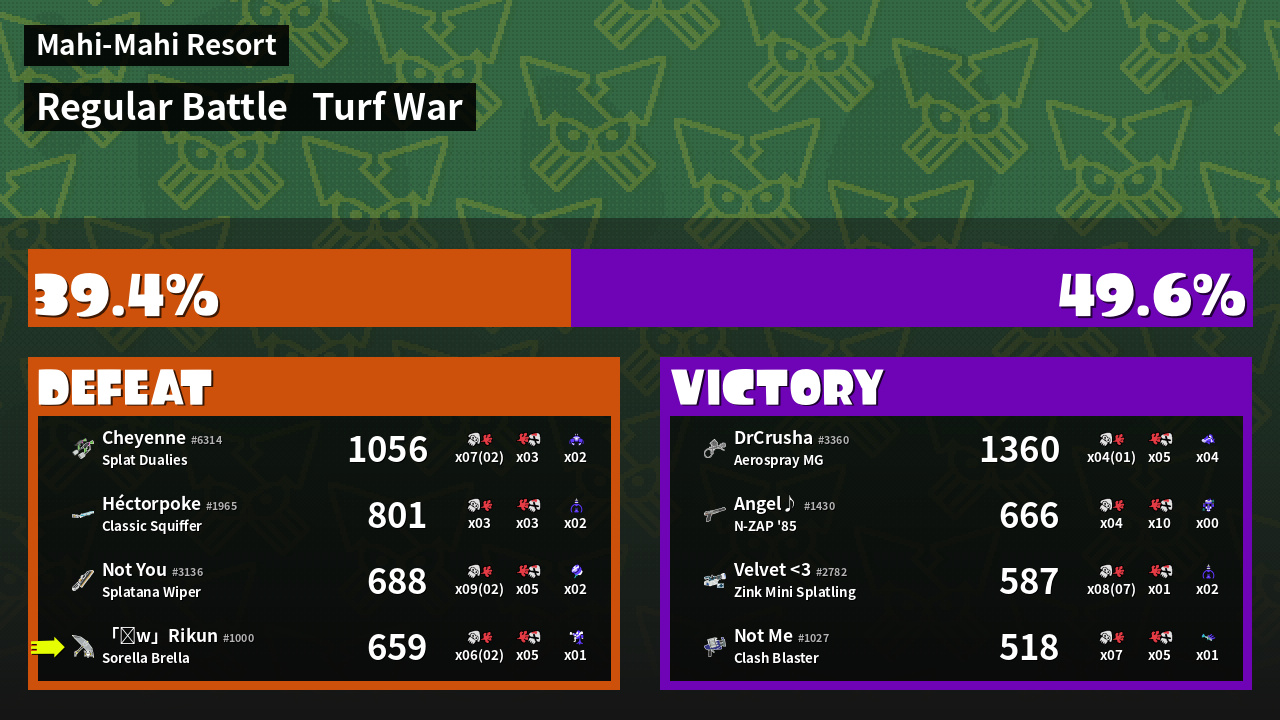 | Medals | #1 Enemy-Base Inker #1 Super Jump Spot #1 Splat Assister | ||