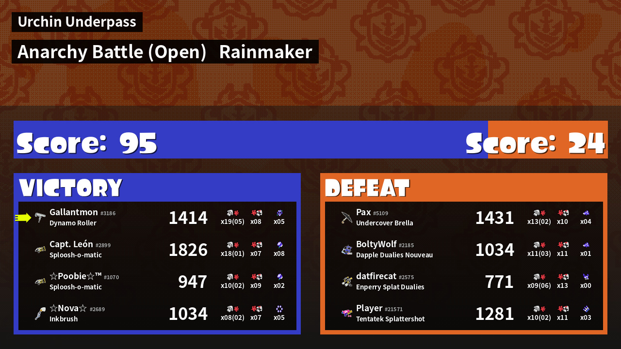 | Medals | #1 Overall Splatter #1 Popular Target #1 Splat Assister | ||